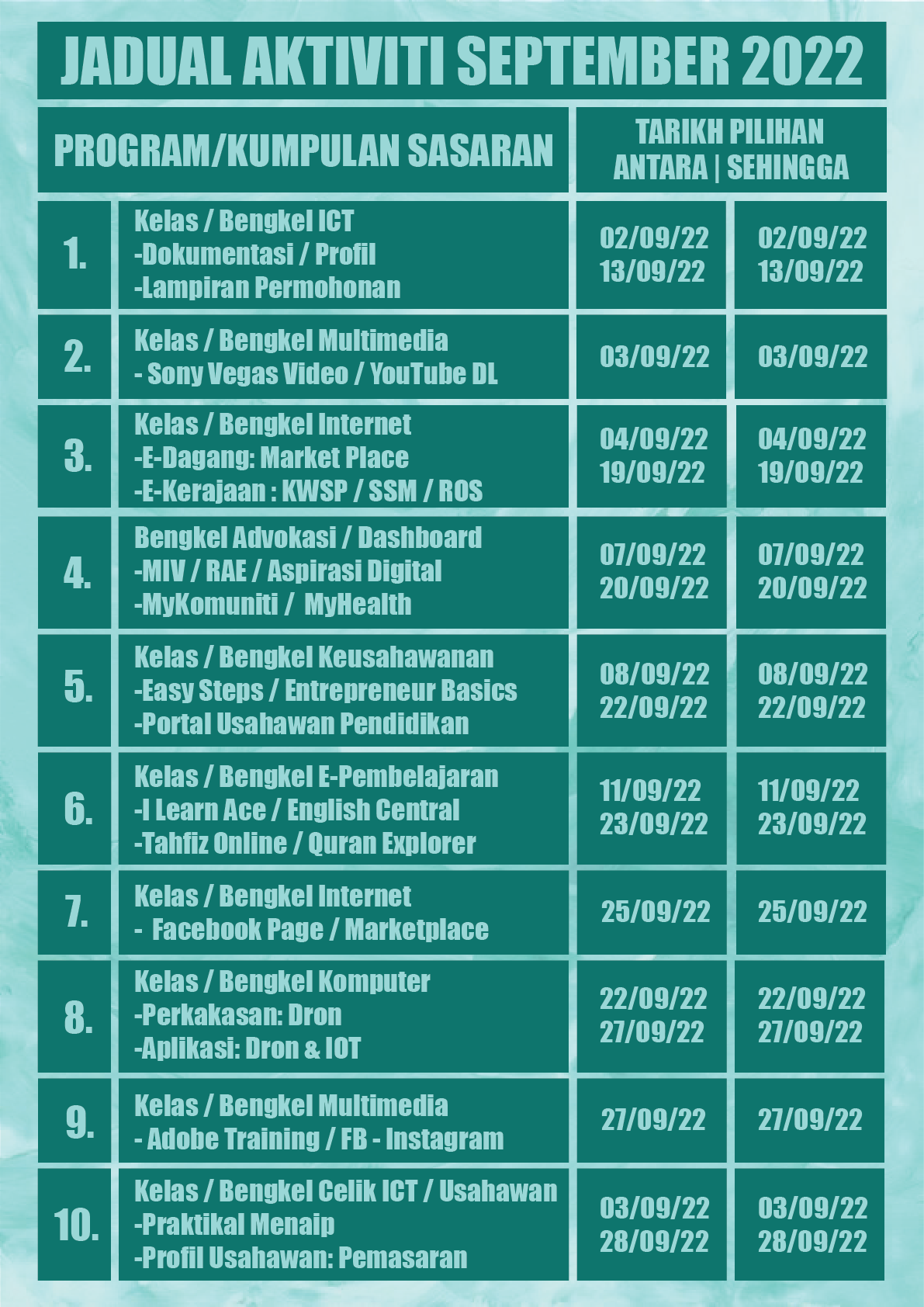 Tarikh : 22hb Julai 2022 Masa : 9.00 Pagi Hingga 10.00 Pagi Peserta : 20 orang Lokasi : PeDi Simpang 4 Rungkup Tujuan: Memberi pinjaman Netbook kepada pengguna untuk penggunaan dari segi, personal, sekolah, usahawan dan kerja persendirian Aktiviti: Pedi memberi pinjaman kepada pengguna […]